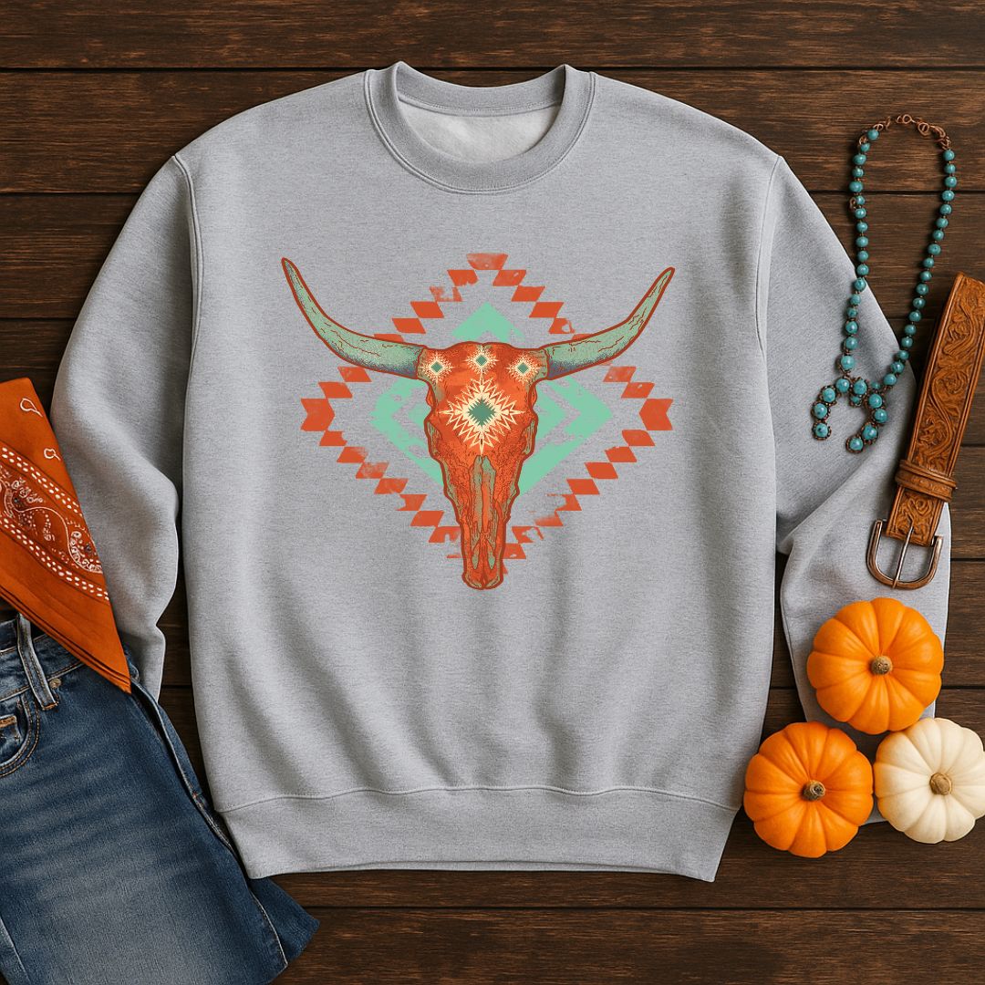 Whispers of the desert, bold as the bones it leaves behind. The Desert Echo Sweatshirt features a striking steer skull set inside a tribal-inspired square, detailed in vivid orange and turquoise tones that capture the soul of the Southwest.