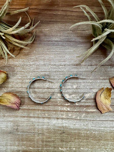 These eye-catching snake eye hoop earrings feature genuine Kingman turquoise set in solid sterling silver with a secure post back. Stamped FY, each pair brings that classic southwestern flair with a bold edge.