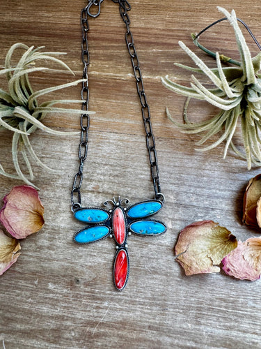 Dragonfly Pendant Necklace – Kingman Turquoise & Red Spiny Oyster – 19 Inch Sterling Silver Dragon Paperclip Chain