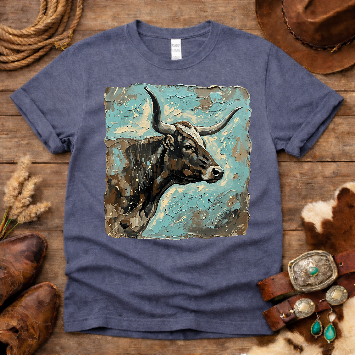 The Blue Mesa Tee features a striking brushstroke longhorn graphic in moody blues and greys, giving it a bold, artistic western look.