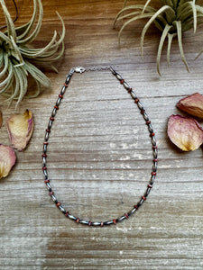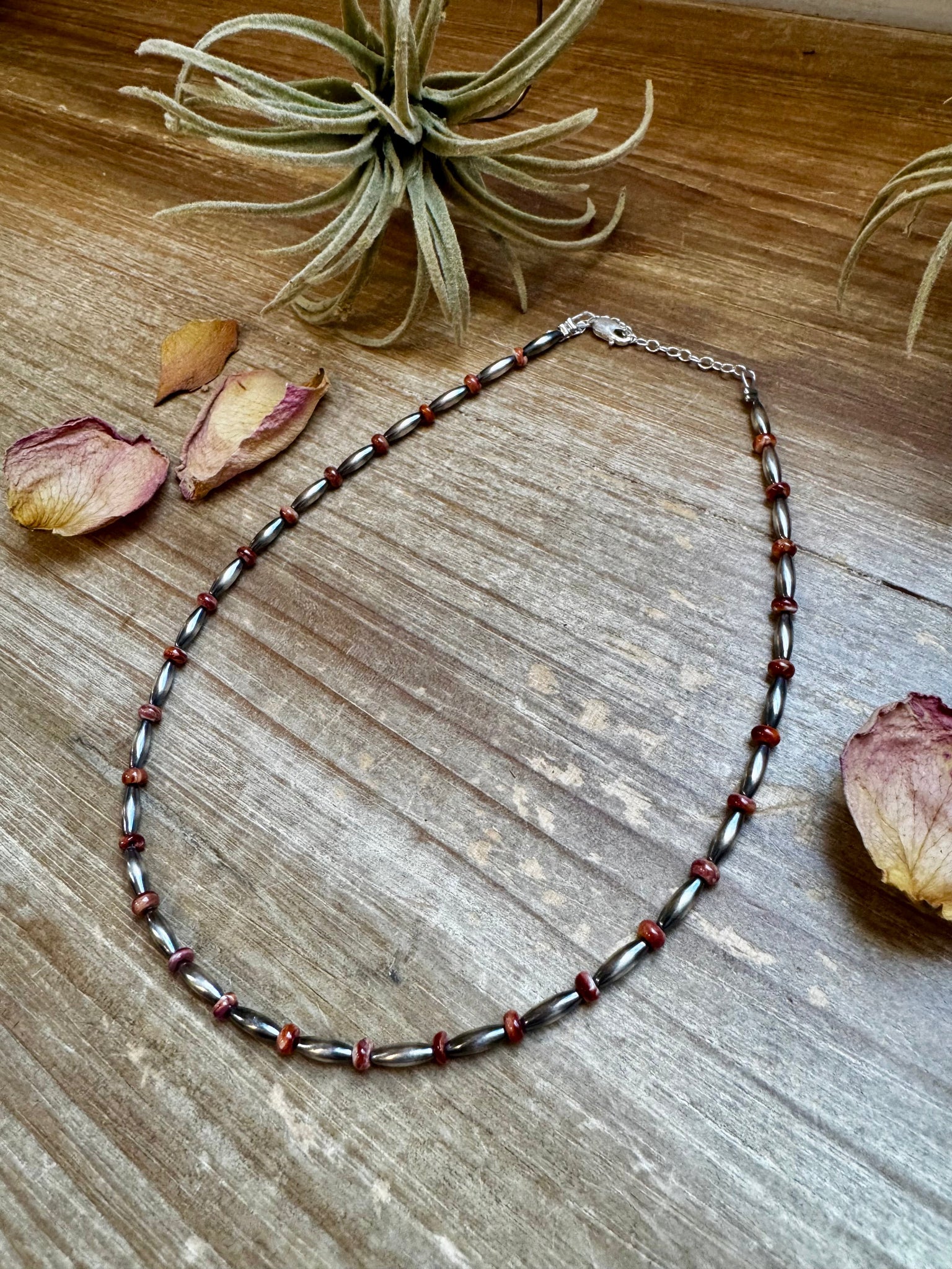 This 14-inch choker is handmade by us in North Texas, featuring our smallest sterling silver torpedo beads (3x9mm)spaced with red and purple spiny oyster heishi.