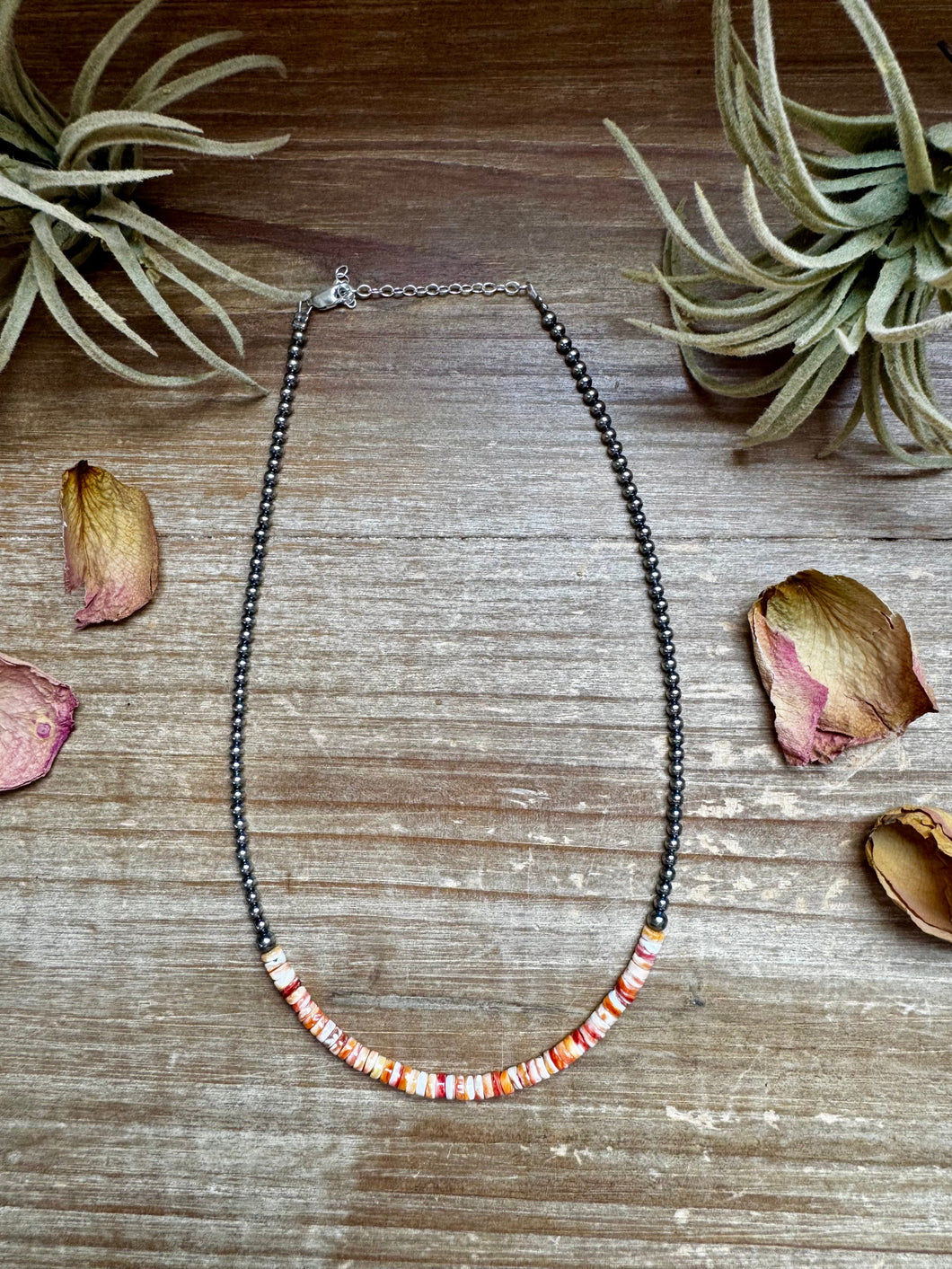 This 15-inch necklace (plus extender) features spiny oyster heishi beads in vibrant orange tones, paired with 3mm and 4mm sterling silver pearls for a statement that’s bold, warm, and full of character.