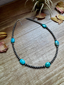 This 15-inch necklace is handmade by us in North Texas, featuring mostly 4mm turquoise beads with a few sprays of 5mm turquoise beads spaced throughout for a natural, effortless look.