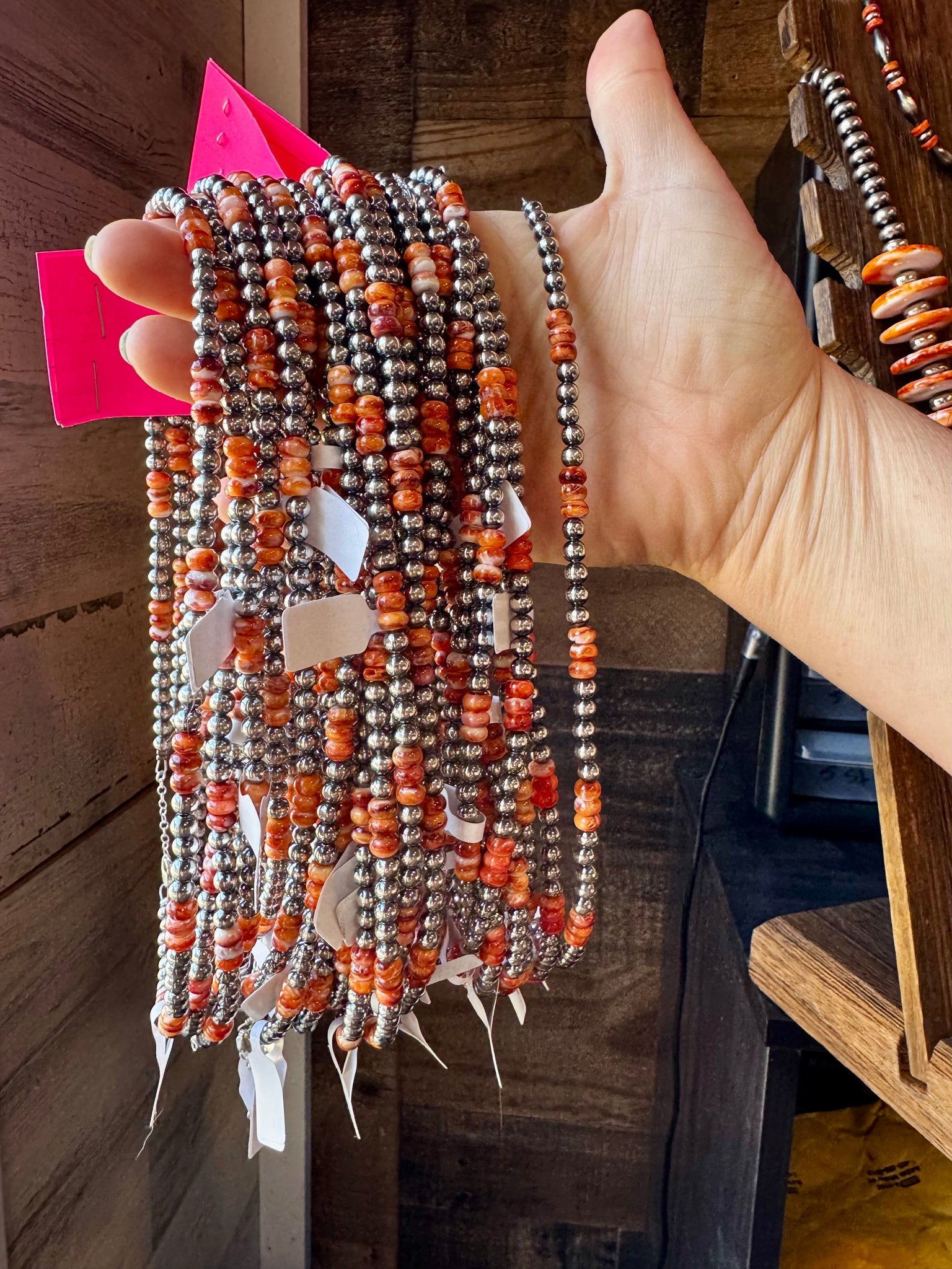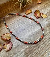 This handcrafted 18-inch necklace features 5mm sterling silver pearls paired with deep orange and red spiny oyster beads for a bold, standout look. A 2-inch sterling silver extender makes it easy to layer and wear daily.