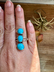 A cute and easy-to-wear piece for everyday style. This sterling silver ring features three Kingman turquoise stones with natural matrix and a simple design perfect for stacking or wearing solo. Lightweight and comfortable, this is your new favorite daily ring.