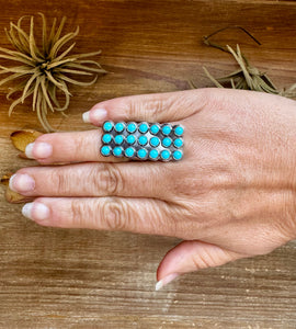 Talk about a showstopper! This bold rectangle-shaped ring is packed with 21 vibrant Kingman turquoise stones, perfectly set in sterling silver. It’s adjustable, so you can wear it on different fingers or gift it without worrying about the size. A true statement piece.