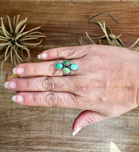 A bold and earthy ring featuring four beautiful green turquoise stones in a striking vertical layout. This adjustable piece is made in the USA and stamped "ZIA" on the back. Each stone has its own unique character and shade, giving the ring a natural, organic feel.