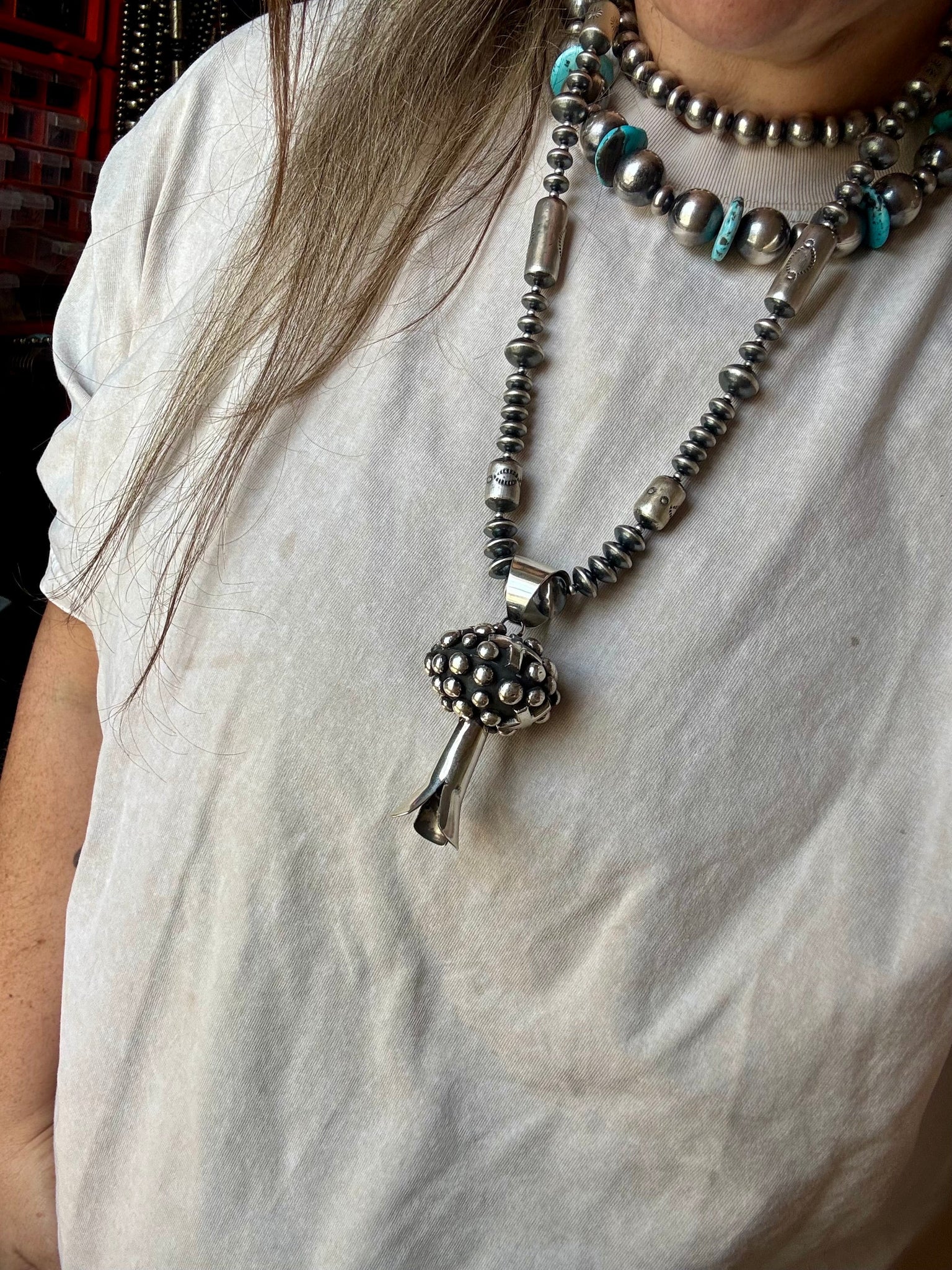 This giant sterling silver blossom pendant is a true showstopper. Native made and beautifully crafted, this bold piece is designed to fit 14mm pearls easily. A statement pendant for collectors and lovers of traditional silverwork — heavy, detailed, and unforgettable.