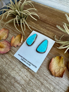 These stunning sterling silver earrings feature vibrant Kingman turquoise stones, handcrafted by Navajo artist Donovan Nez. Their classic and clean design makes them a timeless staple for any collection.