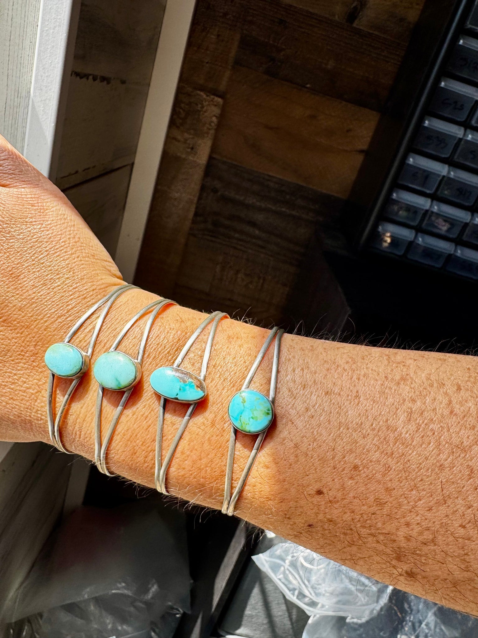 This handcrafted sterling silver cuff features beautiful Sonoran Gold turquoise stones with stunning color and character. Native made in the USA, this cuff has a lot of give for an adjustable fit and can be gently shaped for comfort. Each piece is one of a kind – pick your favorite.