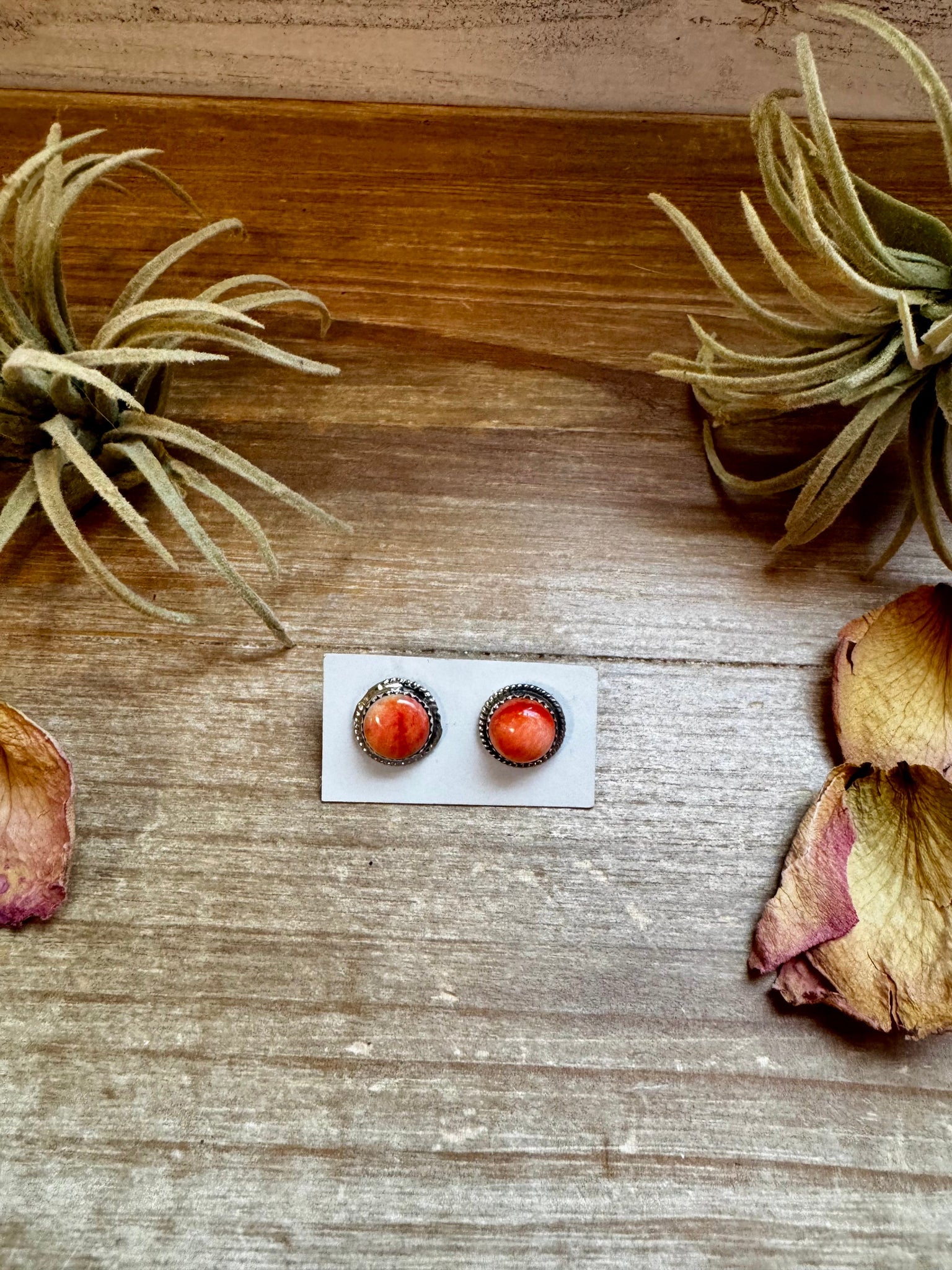 These spiny oyster stud earrings are set in sterling silver and feature beautiful natural color variations in rich shades of orange and red.