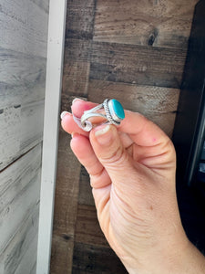 A bold square-shaped Kingman turquoise ring set in sterling silver. The clean lines and natural stone make it perfect for a statement look. Each size fits a different finger—whether you wear it on your index, middle, or ring finger, it brings just the right touch of character.