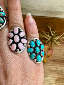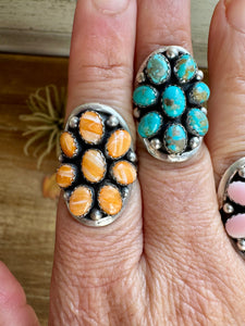 A bold and timeless ring, handcrafted in sterling silver with detailed stamp work. Choose your favorite stone—Kingman Turquoise, Pink Conch, or Spiny Oyster—each bringing its own energy and character to the piece. These rings are beautifully made with a strong band and classic shape.