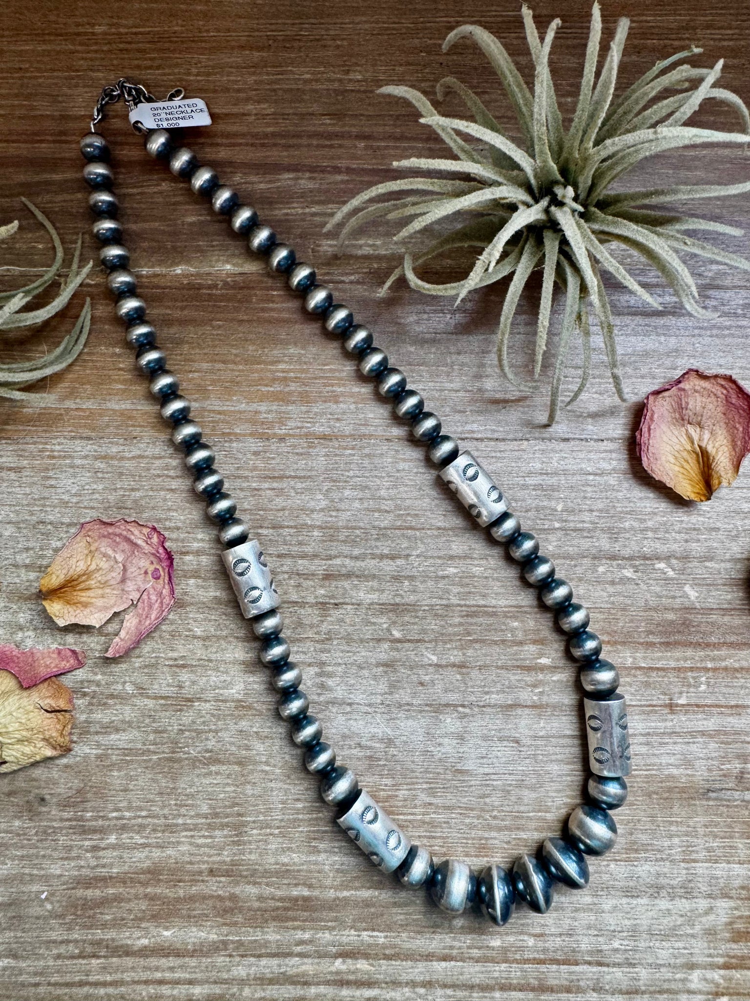 A bold and clean sterling silver necklace featuring 8-12 sterling silver pearls, saucer pearls and sterling barrel beads spaced throughout for a timeless look.