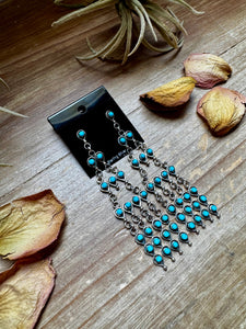 Bold, beautiful, and full of movement. These chandelier-style dangle earrings feature genuine Kingman turquoisestones set in sterling silver, handcrafted in the USA. Each pair has graceful lines, detailed silverwork, and that signature Kingman pop of blue.