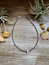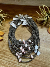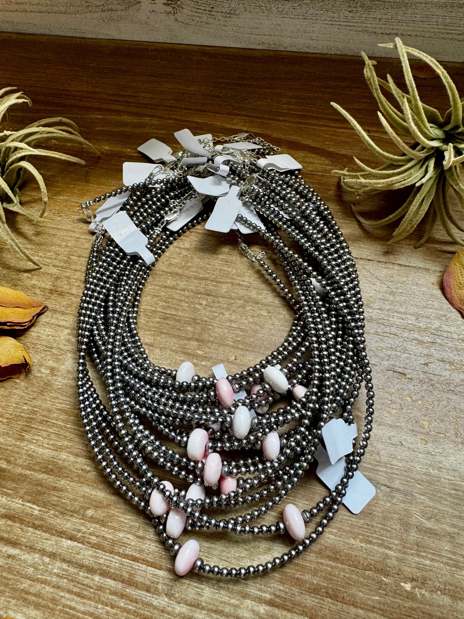 A dainty yet striking choker designed to highlight the beauty of natural pink conch. This 14.5-inch necklace features all sterling silver pearls in 3mm, with a bold 10mm saucer-shaped pink conch bead at the center. Framing the conch are two 4mm sterling silver saucers on each side. Comes with an extender for added length and comfort. Each pink conch bead displays unique color variations due to the natural shell material.