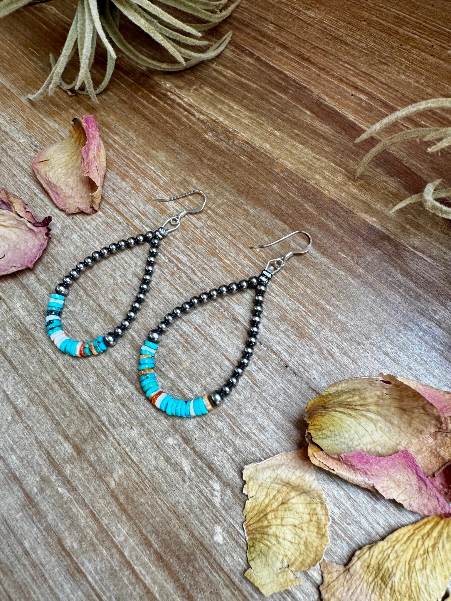 These lightweight drop earrings are handmade by us in North Texas, featuring 3mm and 4mm sterling silver pearls paired with a bold mix of blue turquoise and orange spent heishi beads. Finished on sterling silver pearl hooks for that extra shine.